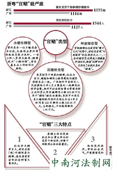 当前位置:法律图书馆>>法治动态>>法治焦点>>中央首晒"官赌":全国查处7162人 浙江广东最多 中央首晒"官赌":全国查处7162人 浙江广东最多 2014-10-11 9:03:22 来源:新京报