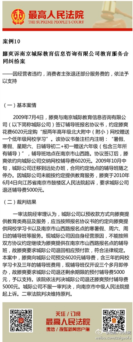 案例10,滕爽诉南京城际教育信息咨询有限公司教育服务合同纠纷案 ——因经营者违约,消费者主张退还部分服务费的,依法予以支持。
