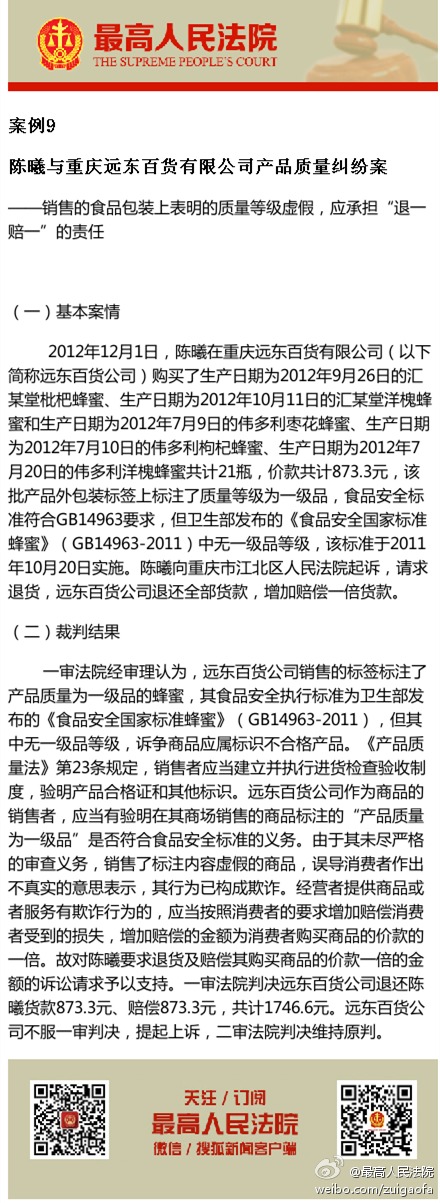 案例9,陈曦与重庆远东百货有限公司产品质量纠纷案 ——销售的食品包装上表明的质量等级虚假,应承担“退一赔一”的责任。