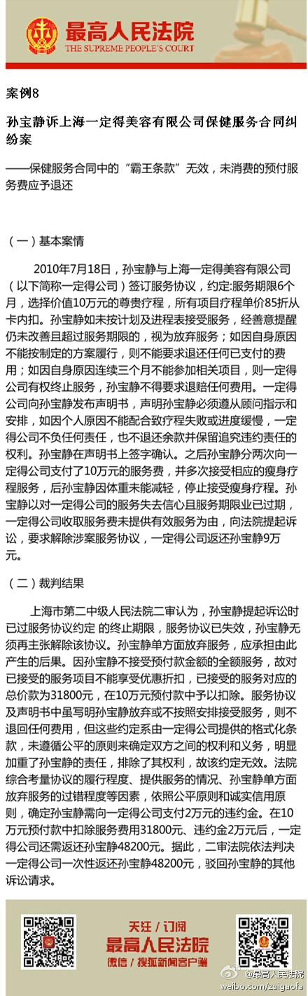 案例8,孙宝静诉上海一定得美容有限公司保健服务合同纠纷案 ——保健服务合同中的“霸王条款”无效,未消费的预付服务费应予退还。