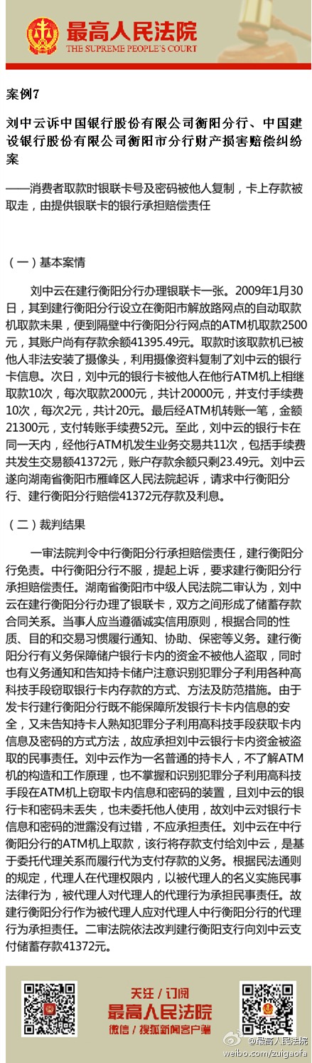 案例7,刘中云诉中国银行股份有限公司衡阳分行、中国建设银行股份有限公司衡阳市分行财产损害赔偿纠纷案 ——消费者取款时银联卡号及密码被他人复制,卡上存款被取走,由提供银联卡的银行承担赔偿责任。