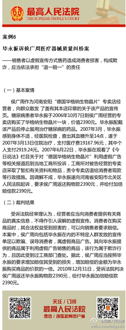 案例6 ,毕永振诉侯广周医疗器械质量纠纷案 ——销售者以虚假宣传方式售药造成消费者损害,构成欺诈,应当依法承担“退一赔一”的责任。