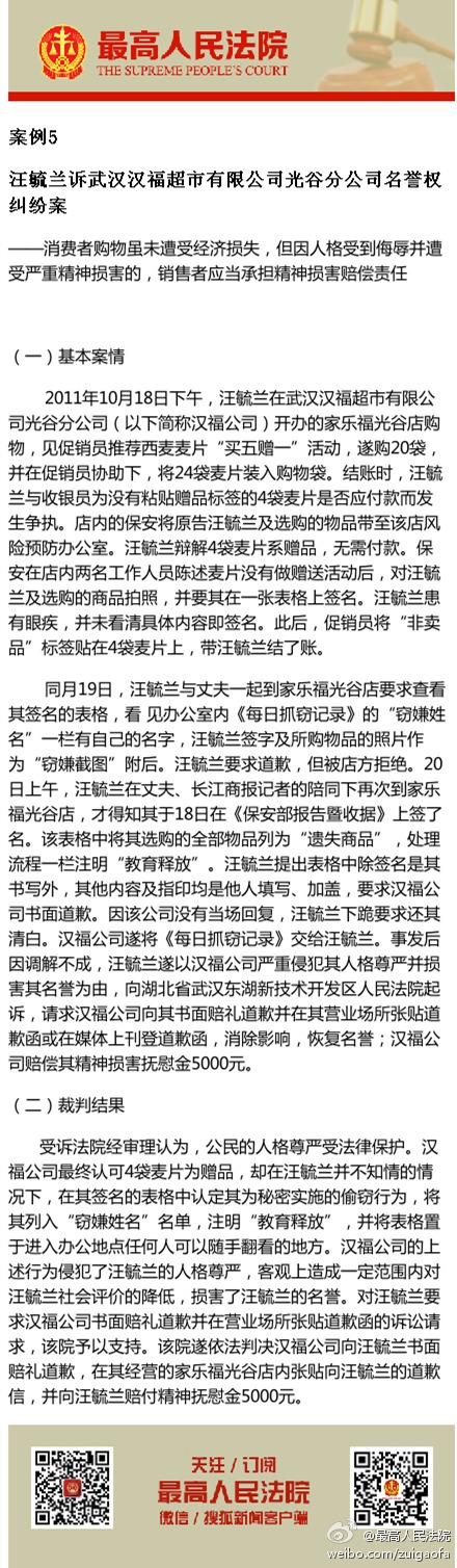 案例5,汪毓兰诉武汉汉福超市有限公司光谷分公司名誉权纠纷案 ——消费者购物虽未遭受经济损失,但因人格受到侮辱并遭受严重精神损害的,销售者应当承担精神损害赔偿责任。