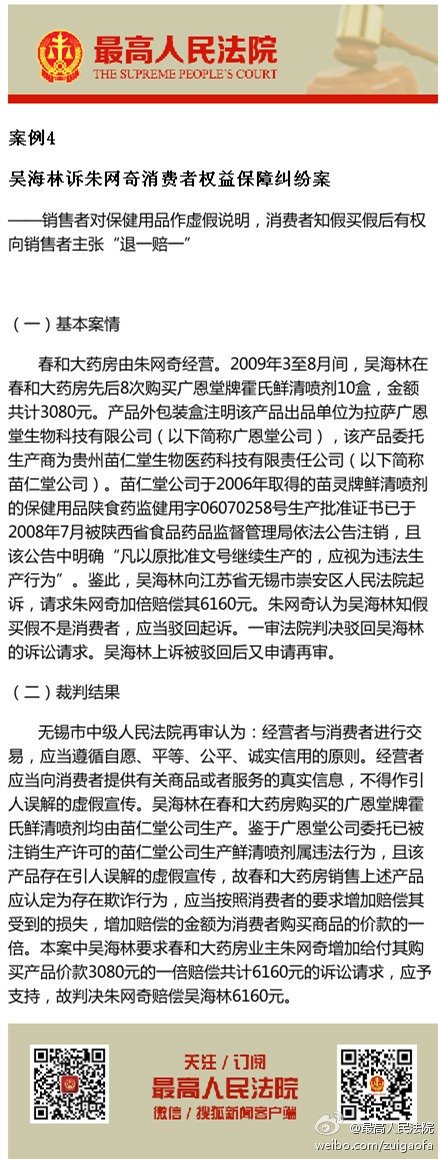 案例4,吴海林诉朱网奇消费者权益保障纠纷案 ——销售者对保健用品作虚假说明,消费者知假买假后有权向销售者主张“退一赔一”。
