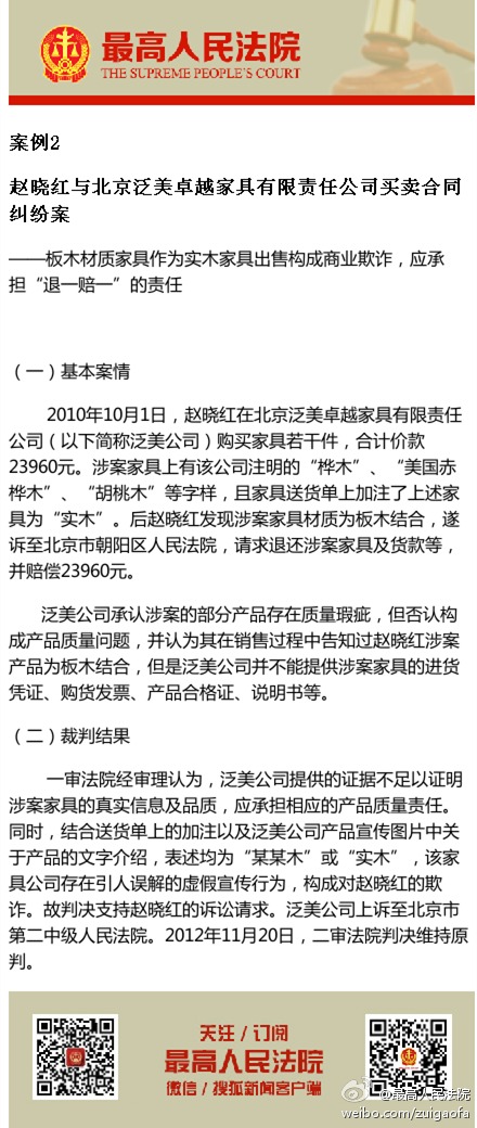案例2 ,赵晓红与北京泛美卓越家具有限责任公司买卖合同纠纷案 ——板木材质家具作为实木家具出售构成商业欺诈,应承担“退一赔一”的责任。