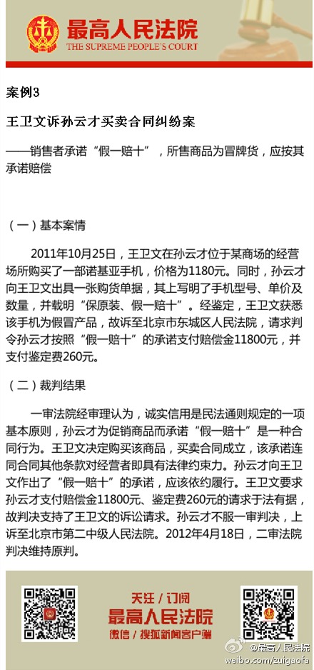 案例3,王卫文诉孙云才买卖合同纠纷案 ——销售者承诺“假一赔十”,所售商品为冒牌货,应按其承诺赔偿。