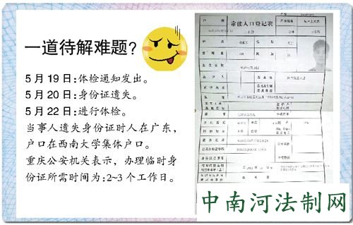 文/广州日报记者潘斌 在中山市2015年公务员考试中,所报考职位笔试和面试成绩均为第一的肖振东,因身份证遗失,不能证明肖振东就是肖振东,在体检时被中山市人社局视为放弃体检资格,直接淘汰出局。 肖振东昨日接受采访时提出疑问,为什么个人的护照、户口簿原件、户籍证明、临时身份证证明、学籍证、学生证等一大堆证明就是证明不了自己的身份,身份证遗失之后,不能先给一个体检的机会吗?而中山市人力资源和社会保障局相关负责人表示,告知其不得参加此次体检是严格依法依规按章办事,确保对每一位考生的公平。 “双料冠军”失体检资格 在中山市2015年公务员考试中,肖振东报考的是中山市教育和体育局纪检监察室科员的职位。其以笔试成绩139.90分,面试成绩84.20分,成功地将该职位笔试和面试第一的成绩收入囊中。 “通知体检的公告,是5月19日在中山市人力资源和社会保障局官方网站上发出来的。”肖振东告诉记者,5月20日,他放有身份证的钱包遗失。身份证遗失后,他马上与招录公务员的单位中山市体育和教育局取得了联系,得到的回复是,组织体检是中山市人力资源和社会保障局负责,作为招录单位不能参与录用公务员体检的工作。 肖振东随后又按照中山市人力资源和社会保障局官方网站发出的《中山市2015年考试录用公务员体检通告》里面的咨询电话反映情况,当时接电话的工作人员则表示,具体问题请查询体检通告。 人社局回应:未能出示身份证或临时身份证而被取消资格 按照肖振东提供的信息,记者在中山市人力资源和社会保障局官方网站,查询了其相关成绩和信息确认无误。中山市人力资源和社会保障局相关负责人接受记者采访时,也确认了肖振东因为遗失身份证,而失去体检资格的事情。 “肖振东当天是有到现场进行体检,因为他未能出示身份证或临时身份证,根据《广东省2015年考试录用公务员公告》相关规定,居民身份证是考生参加考试或体检的唯一居民身份证明,临时居民身份证是唯一可代替身份证的法定居民身份证明凭证,因此该考生不得参加此次体检。”中山市人力资源和社会保障局相关负责人介绍。 该负责人还介绍,5月20日,肖振东发现身份证无法找到,但不能确定是否遗失,当时没有报警。考生随后向户籍地公安局申办临时身份证,因其户籍所在地重庆不能在22日前办理好临时身份证,故其体检报到时出示了户籍地公安机关出具的户籍信息证明和广东省公安厅机场公安局出具的乘坐中国民航飞机临时身份证明,而机场的临时身份证明由中国民用航空总局公安局印制,只限于乘坐中国民航飞机时有效。 该负责人表示,根据《广东省2015年考试录用公务员公告》的附件3《广东省2015年考试录用公务员报考指南》第28、29和30条规定,已对遗失身份证如何参加考试或体检,或其他证件能否代替居民身份证参加考试或体检作出明确说明。作为以上规定的执行部门,为确保每一位公务员考试的公平公正,必须严格依法依规按章办事,因此中山市人力资源和社会保障局告知其不得参加此次体检。 留下问题 当临时身份证都来不及办 该如何证明自己是自己? 为何不及时办理临时身份证来参加体检?肖振东告诉记者,5月20日身份证遗失时人在广东,作为西南大学的应届毕业研究生,户口在西南大学集体户口上,重庆公安机关表示,办理临时身份证需要2~3个工作日,能够马上出具的只有一份临时身份证证明,而体检是5月22日早上7时30分报到,在办理临时身份证的时间上根本来不及。 根据《广东省2015年考试录用公务员报考指南》,居民身份证办理受理回执或户口所在地派出所开具的带有考生本人照片并加盖公章的居民身份证明,也不能代替居民身份证参加考试或体检。 那么,在临时身份证也无法及时出具的情况下,录用公务员体验时,需要怎样证明自己的身份?作为组织公务员考试的人社部门,并无具体的措施。 《中山市2015年考试录用公务员体检通告》里面提到:如居民身份证失效、遗失或更换中的,应当及时向公安机关申请办理临时居民身份证,至于无法及时办理临时身份证如何证明,并没有给出措施。 记者在省人力资源和社会保障厅官方网站上的《广东省2015年考试录用公务员公告》里面看到,体检工作按照修订后的《公务员录用体检通用标准(试行)》等多个文件的规定组织实施。而上述标准和细则更多的是对录用公务员体验的标准和内容做出公告,在身份证遗失,甚至是临时身份证也无法及时办理的情况,如何证明自己就是自己,也没有给出具体的措施。 |