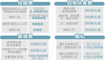 龚武制图 日前,省财政厅发布《四川省省级单位外宾接待经费管理办法》,规定了省级单位在接待外宾过程中产生的住宿费、日常伙食费、宴请费、交通费、赠礼等报销标准。同时对招待天数、人数等都作了详细要求。 标准从严: 赠礼不得超过400元 住宿费方面,副部长级及以上人员率领的外宾代表团,可安排在五、四星级宾馆,其余安排的宾馆最高不超过四星级。副部长级及以上人员可安排普通套间,其他人员安排标准间。 日常伙食费方面,国家元首、政府首脑级每人每天600元;副总统、副总理和正、副议长级每人每天550元;正、副部长级每人每天500元;其他人员每人每天300元。 宴请费方面,省领导出面举办的宴会,每人每次400元,厅级及以下人员出面举办的宴会,每人每次300元。冷餐、酒会、茶会分别为每人每次150元、100元、60元。 交通费方面,副部长级及以上外宾可提供飞机头等舱和火车软席 (含高铁/动车商务座、全列软席列车一等座、火车高级软卧),其他人员可提供飞机经济舱和火车软席(含高铁/动车一等座、全列软席列车一等座、火车软卧)。在符合礼宾要求的前提下,外宾出行应当集中乘车,减少随行车辆。 赠礼方面,如确有需要,经审批后,可由接待单位赠礼1次,其他单位不得重复赠礼。赠礼方或受礼方为正、副部长级人员的,每人次礼品不得超过400元;赠礼方或受礼方为司局级人员的,每人次礼品不得超过200元。办法规定,赠礼对象仅为外方团长。 范围从严: 五项费用外一律自理 除国家元首、政府首脑外,外宾在川期间的接待费用将严格控制在住宿费、日常伙食费、宴请费、交通费、赠礼等五项范围内。五项之外的费用,均由外宾自理。 外宾在川期间,宴请不得超过两次。对应邀来川的外宾,省级单位应根据互惠对等原则或对外交流协议等,法制网,区分为全部招待、部分招待和外宾自理。无互惠对等原则及外事交流协议的,招待天数原则上不得超过5天(含抵、离当天),招待人数可由省级单位按内部规定执行,超出规定天数和人数的,一律由外宾自理。 办法同时规定,各接待单位原则上不得列支外宾来川旅费。 管理从严: 未经批准不得邀请来访 《办法》还在制度层面进行规定。未经授权批准,省级单位一律不得对外发出正式邀请或做出接待承诺。接待计划应当明确外宾团组中由我方招待的人数、天数,费用开支范围以及资金来源、列支渠道、预算等。计划编制必须严格控制在年度接待经费预算内,不得突破。 办法要求,省级单位应当从严从紧控制外宾接待经费,严格执行接待费开支标准和范围,不得擅自突破,不得向同级机关、下级机关、下属单位和企业等摊派、转嫁费用。 除涉密内容和事项外,外宾接待经费的预决算应当按照预决算信息公开的有关规定,及时公开,接受社会监督。《办法》明确,在接待过程中,凡擅自提高接待开支标准;计划未经批准接待外宾;违规扩大外宾接待开支范围,报销与接待无关的费用;虚报外宾接待级别、人数、天数,套取接待经费的;或使用虚假发票报销接待费用的,一律责令整改,追回资金,并追究有关人员责任。 解读 相比中央规定我省在四个方面更细化 4月1日,记者邀请省财政厅外事外债处相关负责人,第一时间对《四川省省级单位外宾接待经费管理办法》进行权威解读。 记者:总统的伙食费才600元,这样的标准是否会影响接待效果? 答:在编制这个标准之前,财政厅外事外债处相关同志专门对成都市的大型酒店、宾馆进行了实地走访,进行了详细的价格核算。然后我们与省外侨办等单位座谈,了解外事接待中的实际需求。制定该标准,兼顾了接待需求和接待费用最小化的结果。 记者:相比中央出台的外宾接待经费管理办法,我省有哪些特点? 答:我省的办法规定更细致、更严格。主要体现在四个方面。首先是赠礼,我省比中央的规定中多增加了必要性审核、申报流程两个方面,对该项费用管控更严。第二,我省的办法增加了对接待访问我省的著名友好人士、社会名流、专家学者的规定。第三,在范围上更严格,中央的规定是“外宾在华期间的医药、邮电通讯、洗衣、理发等费用,除国家元首、政府首脑外,均由外宾自理”,我省则规定除住宿费、日常伙食费、宴请费、交通费、赠礼五项费用外,均由外宾自理,用“排除法”就能避免中间的模糊领域,执行度更高。第四,对陪同人员的误餐补助,我省把“每人每次50元”细化为“每人每次早餐20元、午餐40元、晚餐40元。”(记者 陈岩) |