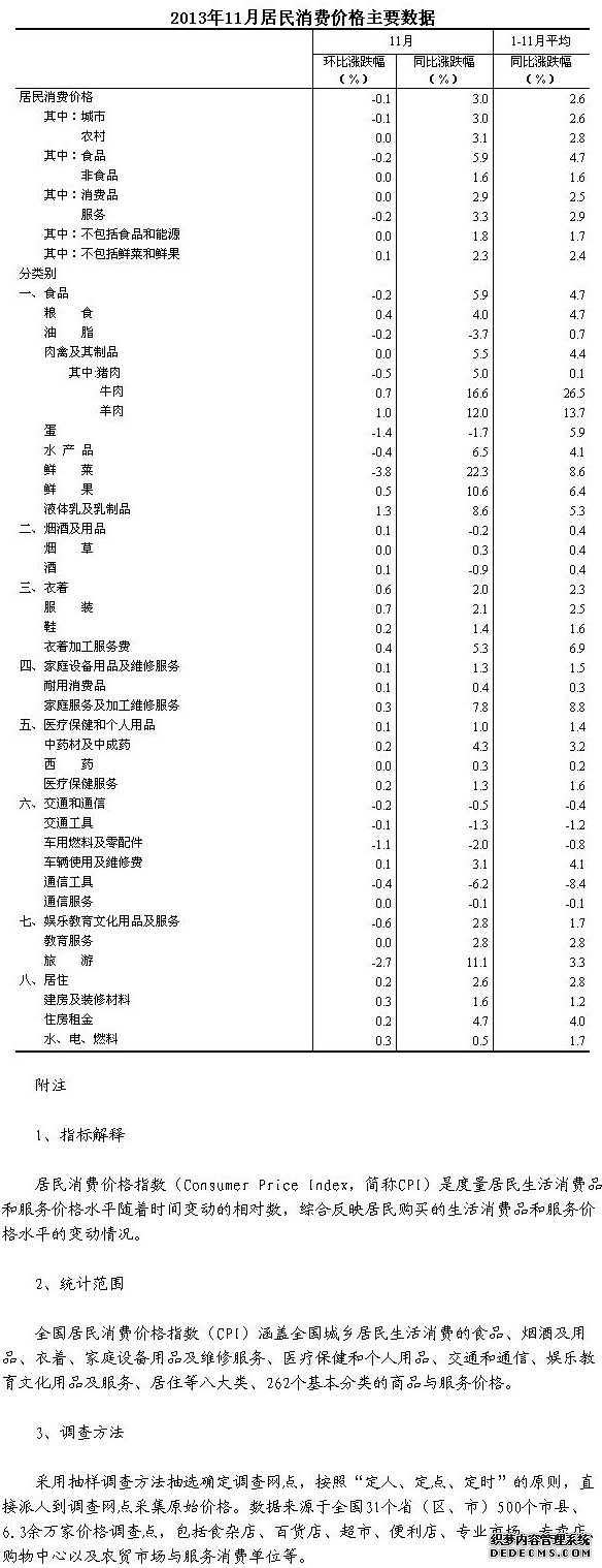 2013年11月份,全国居民消费价格总水平同比上涨3.0%。其中,城市上涨3.0%,农村上涨3.1%;食品价格上涨5.9%,非食品价格上涨1.6%;消费品价格上涨2.9%,服务价格上涨3.3%。1-11月平均,全国居民消费价格总水平比去年同期上涨2.6%。