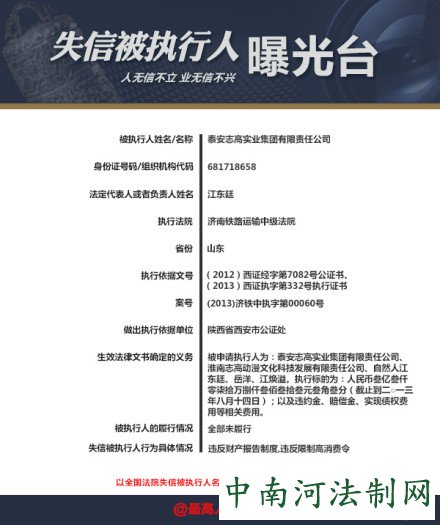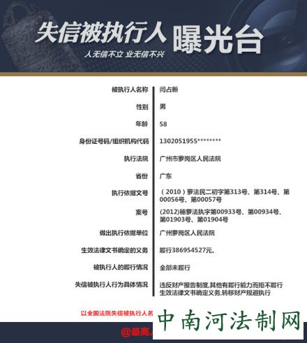 首日曝光的失信被执行法人 央广网北京9月1日消息(记者谢梦瑶)最高人民法院官方微博消息称,为推进社会信用体系建设,加大对失信被执行人的惩戒力度,促使其自动履行生效法律文书确定的义务。最高人民法院执行局、新闻局联合推出“失信被执行人曝光台”,信用惩戒进入“微时代”。9月1日起,最高人民法院微博、微信将每天曝光一名失信被执行自然人和一名失信被执行法人。 国内欠人钱财却赖着拒不履行法院生效判决的债务人(俗称“老赖”)广泛存在,已经成为当今经济社会的一种痼疾。为了有效治理“老赖”现象,最高人民法院先后于2013年7月、11月和2014年1月三次召开新闻发布会,集中对失信被执行人名单信息的公开等情况进行通报,建立了网上的“老赖”黑名单系统。社会各界人士点击“全国法院失信被执行人名单信息公布与查询”,输入姓名就可以查询失信被执行人名单信息。 截至今日(1日)上午10时,全国法院失信被执行人名单信息公布与查询平台共计公布失信被执行人401465名。其中自然人346335名,法人或者其他组织55130名。 延伸阅读 什么是失信被执行人? 被执行人具有履行能力而不履行生效法律文书确定的义务,并具有下列情形之一的,人民法院应当将其纳入失信被执行人名单,依法对其进行信用惩戒。 1、以伪造证据、暴力、威胁等方法妨碍、抗拒执行的; 2、以虚假诉讼、虚假仲裁或者以隐匿、转移财产等方法规避执行的; 3、违反财产报告制度的; 4、违反限制高消费令的; 5、被执行人无正当理由拒不履行执行和解协议的; 6、其他有履行能力而拒不履行生效法律文书确定义务的。 可以对失信被执行人采取的行为 1、禁止部分高消费行为,包括禁止乘坐飞机、列车软卧; 2、实施其他信用惩戒,包括限制在金融机构贷款或办理信用卡; 3、失信被执行人为自然人的,不得担任企业的法定代表人、董事、监事、高级管理人员等。 (信息来源:《最高人民法院关于公布失信被执行人名单信息的若干规定》、《“构建诚信 惩戒失信”合作备忘录》) 日期:2014-9-1 12:54:45 | |