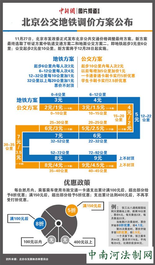 11月27日,北京市发改委正式发布北京公共交通价格调整最终方案。新方案最终选取了听证方案中轨道交通方案二和地面公交方案二,即地铁起步3元坐6公里;公交起步2元坐10公里。新方案将于12月28日起实施。 |