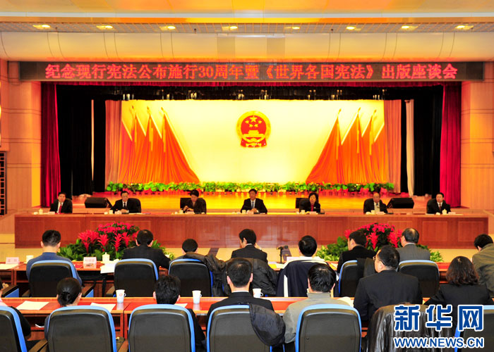 为纪念我国现行宪法颁布实施30周年,集联合国193个成员国的宪法文本译成约1280万字的中文文本集《世界各国宪法》一书于11月出版发行。2012年12月7日,纪念现行宪法公布施行30周年暨《世界各国宪法》出版座谈会在京举行。(新华网 卢俊宇摄)